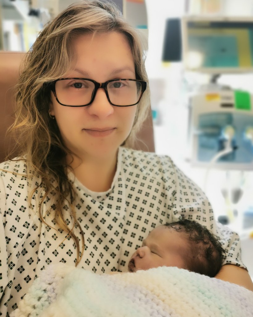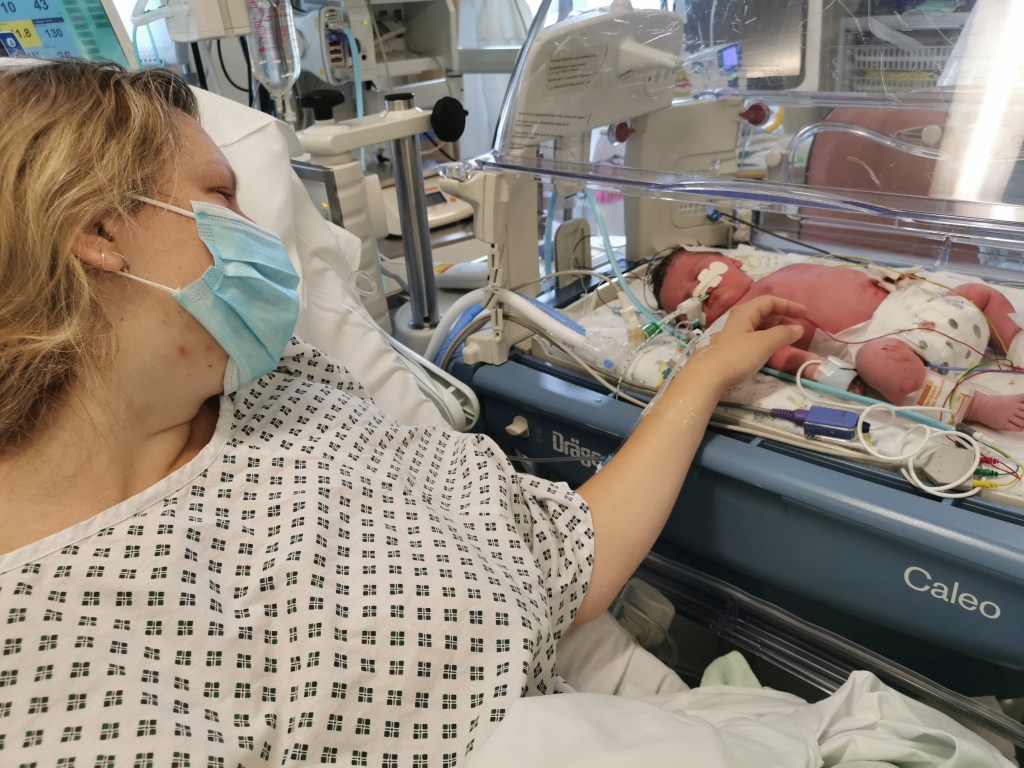 Ten days overdue, during a heatwave in July, I finally went into labour. We’d planned for a home birth and I was genuinely more excited than nervous about the experience. I’d managed to get to 10cm (or so I was told) using just my Freya app (a must have for labour I think) and a tens machine. Labour at home had been everything I’d hoped for: calm, powerful and magical. After I’d been pushing for hours in the birth pool with some much-needed gas and air, my midwife discovered my cervix was swollen and I wasn’t actually fully dilated, so we headed to hospital.